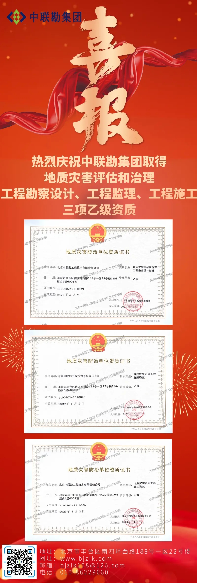 资质的升级和获取是行业准入的前提,也是获取企业发展机会、提升行业竞争力的有效途径。中联勘集团将以此次地灾资质升级为动力,加强企业在地灾专业能力方面的核心竞争力,为项目施工生产、公司高质量发展贡献力量,在急难险重中勇毅破局、在时代浪潮中砥砺前行!