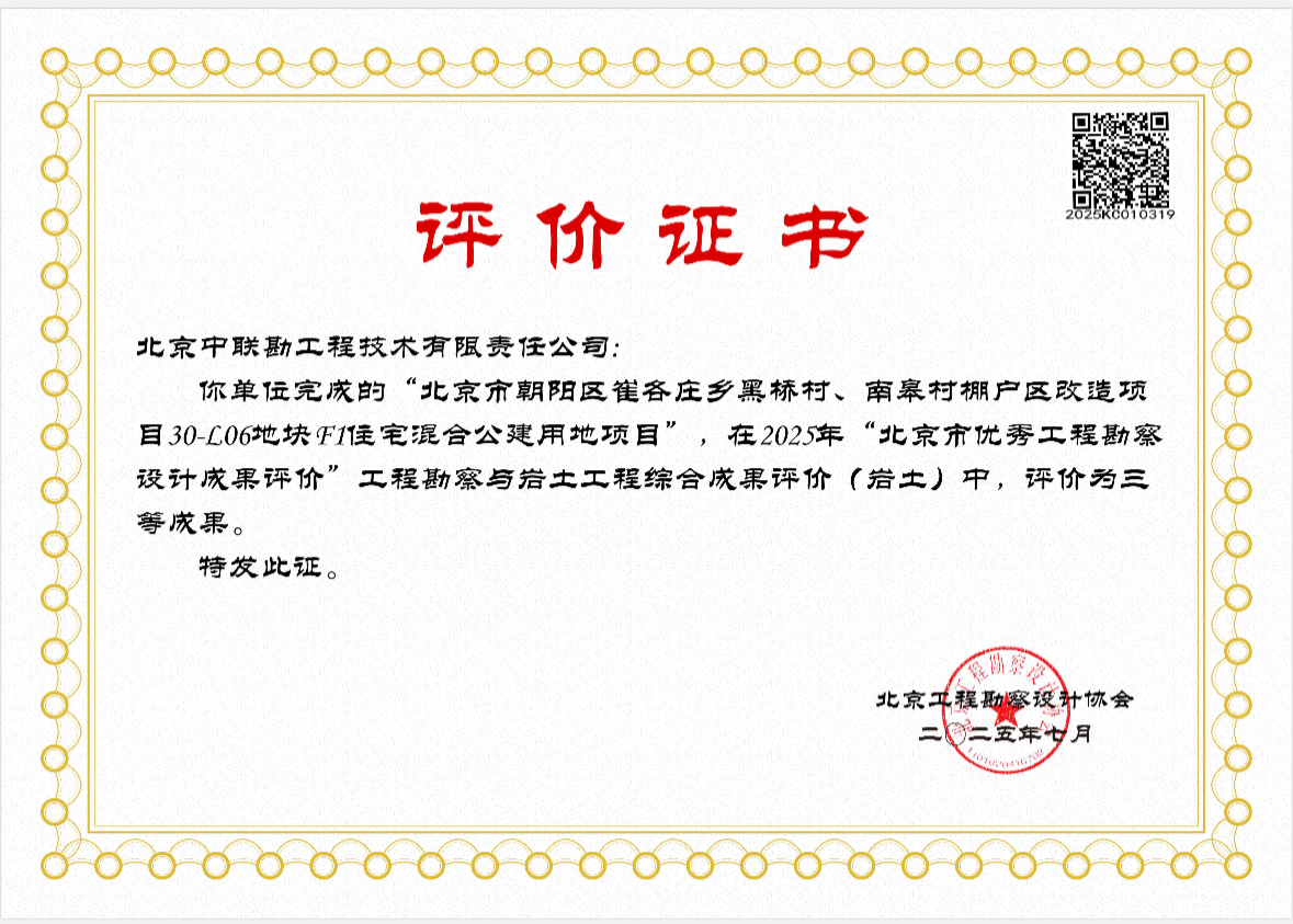 喜报频传,捷报再续!由北京中联勘工程技术有限责任公司完成的“北京市崔各庄乡黑桥村、南臬村棚户区改造项目30-L06地块F1住宅混合公建用地项目”,在2025年度北京市优秀工程勘察设计成果评价中荣获“工程勘察与岩土工程综合成果评价(岩土)”三等成果评价。这一成果充分展现了我公司在岩土勘察领域的技术实力与专业水平。