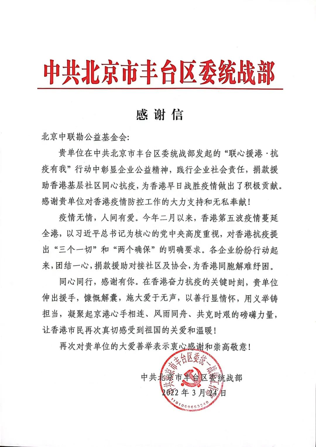 近日,中联勘公益基金会收到了一封来自北京市丰台区委统战部的感谢信。信中丰台区委统战部对基金会为香港疫情进行爱心捐赠一事致以了衷心的感谢和崇高的敬意!