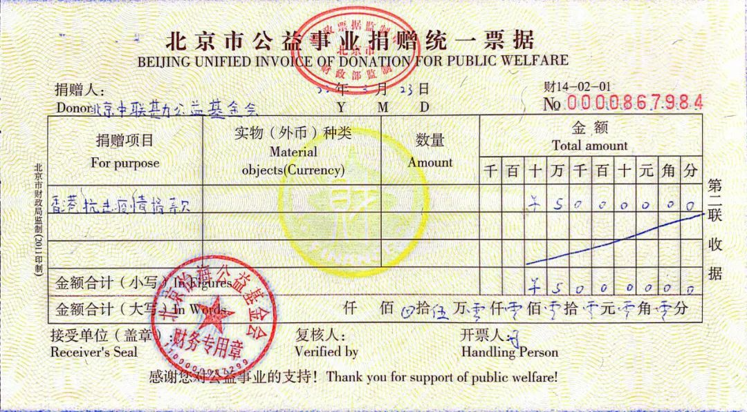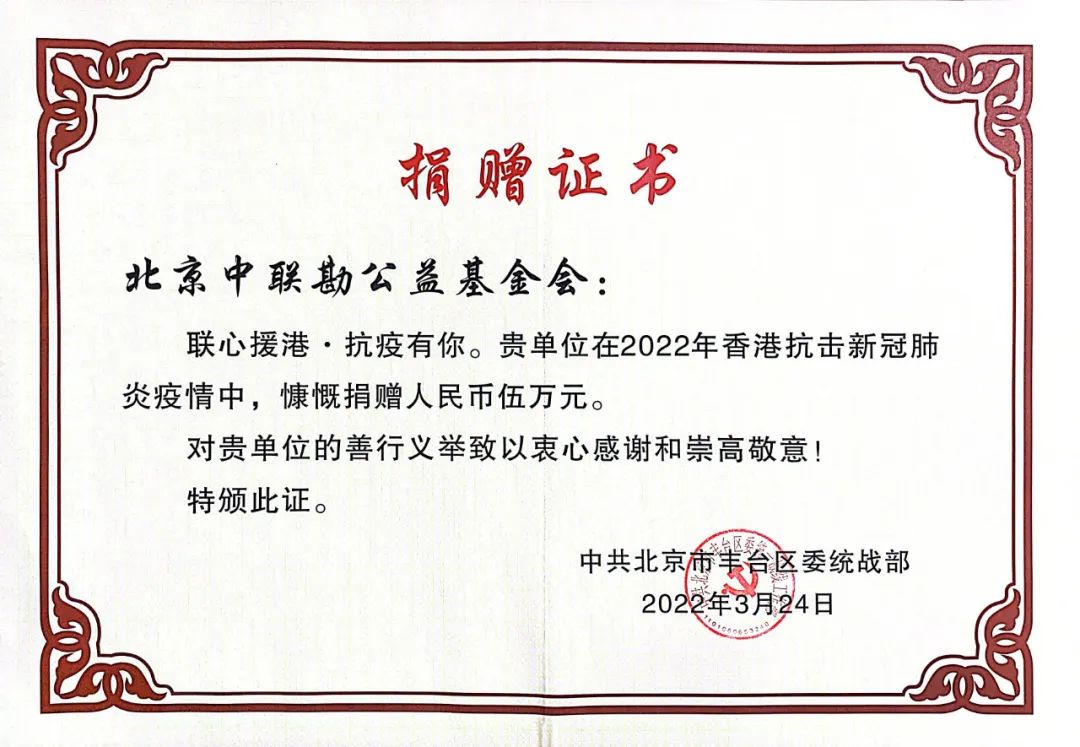 2022年年初,新冠疫情再次席卷香港,在港区人民再次陷入水深火热的抗疫生活中时,内地同胞也时刻牵挂着香港,一刻也没有停下援港抗疫的行动。其中,中联勘公益基金会积极响应北京市丰台区号召,向港区政府部门捐赠人民币5万元,为香港同胞解难纾困,也为他们带去一份来自祖国内地深沉的关爱与温暖。