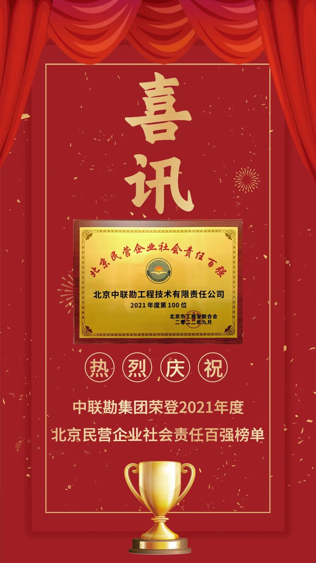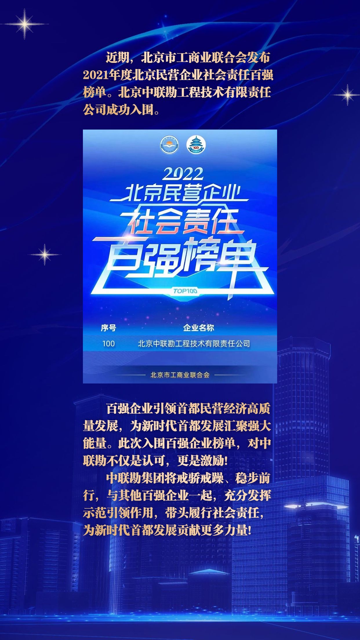 喜报 | 热烈祝贺中联勘荣登2021年度北京民营企业社会责任百强榜单!