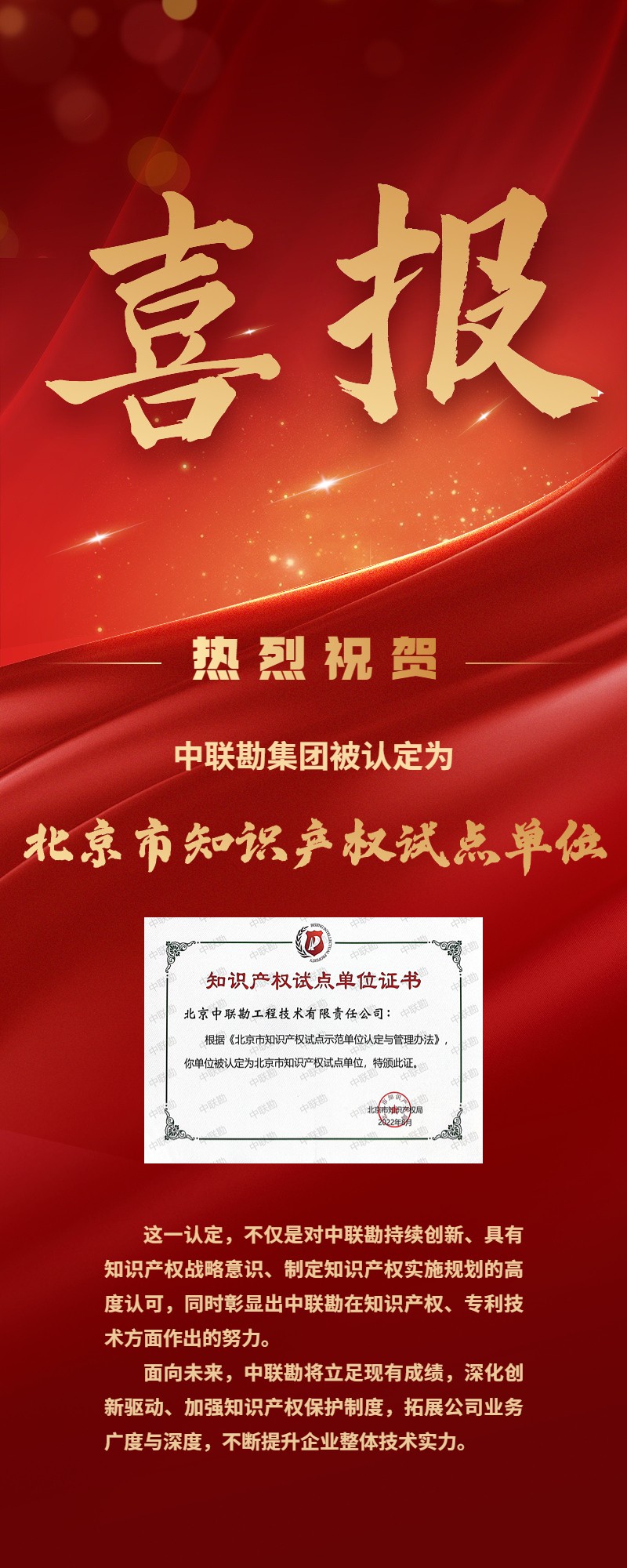 喜报 | 热烈祝贺中联勘荣获北京市知识产权试点单位认定!