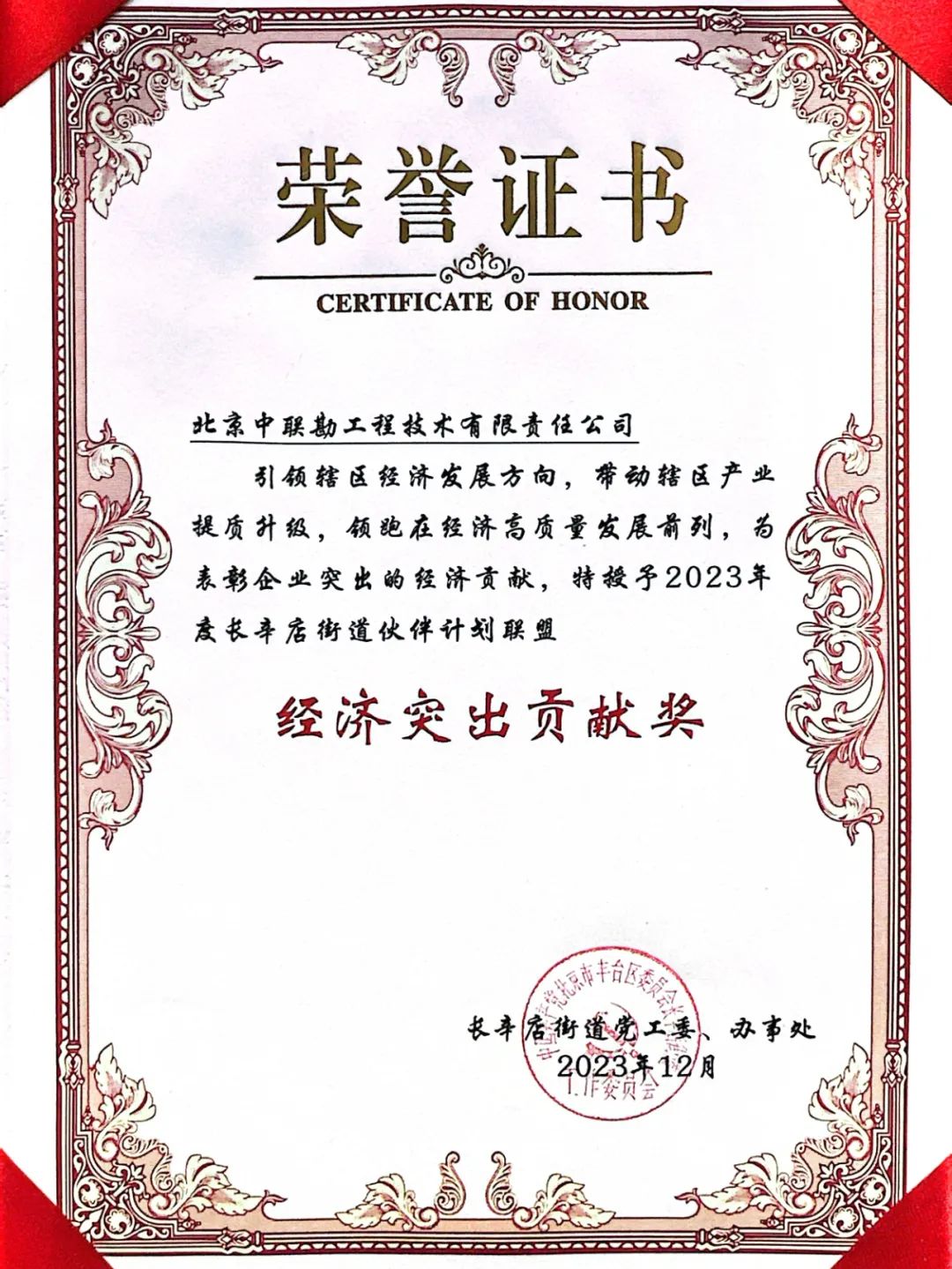 12月20日,丰台区长辛店街道召开2023年度合作伙伴计划联盟总结表彰大会。此次会议旨在表彰在公益事业、经济贡献和合作伙伴关系方面表现突出的联盟成员单位。中联勘集团荣获“经济突出贡献奖”。